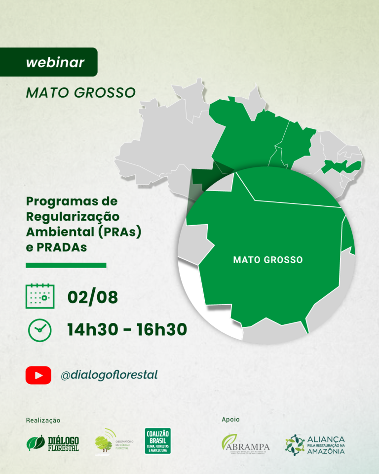 O evento, realizado pelo Diálogo Florestal em parceria com o Observatório do Código Florestal e a Coalizão Brasil Clima, Florestas e Agricultura, tem apoio da Associação Brasileira dos Membros do Ministério Público de Meio Ambiente (Abrampa) e da Aliança pela Restauração na Amazônia, e faz parte de uma série iniciada em 2021. O tema já discutiu a temática em Estados como Santa Catarina, Pernambuco, Pará, Maranhão e Tocantins, totalizando 14 unidades federativas cobertas pela iniciativa. Para o último evento da série, previsto para 23 de agosto, será analisada a situação da implementação dos PRA e PRADAs no contexto da União.