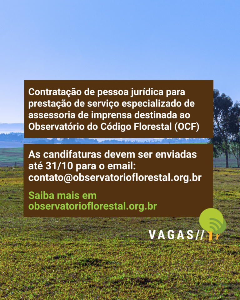 O Observatório do Código Florestal está em busca de pessoa jurídica para prestação de serviço especializado de assessoria de imprensa destinada ao Observatório do Código Florestal (OCF) com o propósito de ampliar a visibilidade das ações relacionadas aos lançamentos e eventos abaixo: