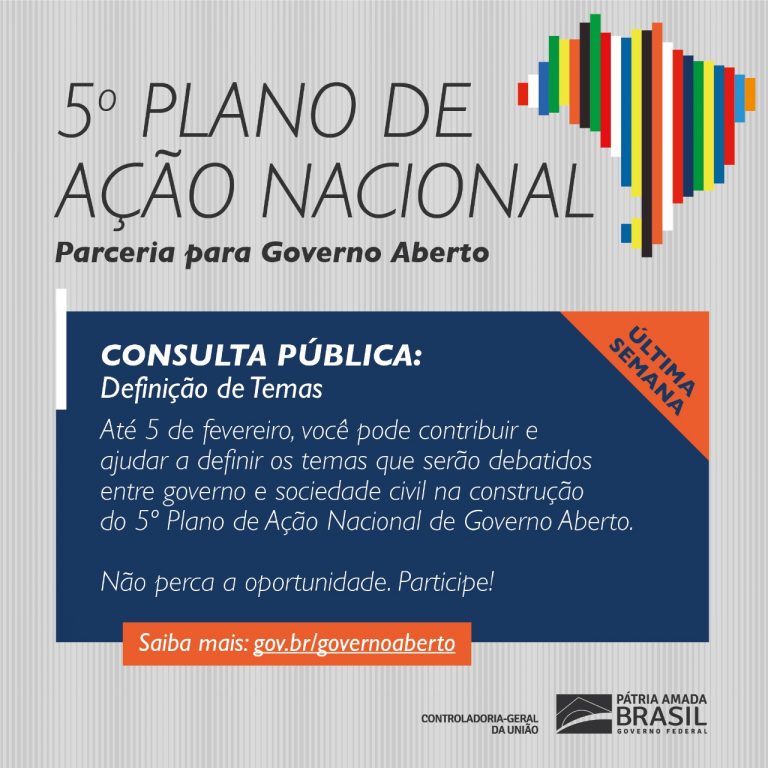 O 5° Plano de Ação Nacional no âmbito da Parceria para Governo Aberto está em processo de elaboração, e deve ser construído de forma conjunta pelo governo e pela sociedade civil. Nesta primeira etapa, qualquer cidadão pode participar indicando temas que considera prioritários para serem debatidos por especialistas e inseridos no Plano.