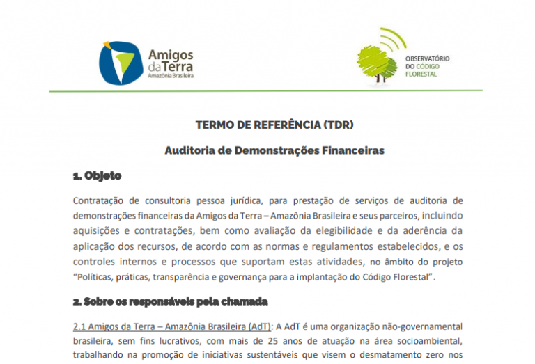 Contratação de consultoria pessoa jurídica, para prestação de serviços de auditoria de demonstrações financeiras da Amigos da Terra – Amazônia Brasileira e seus parceiros, incluindo aquisições e contratações, bem como avaliação da elegibilidade e da aderência da aplicação dos recursos, de acordo com as normas e regulamentos estabelecidos, e os controles internos e processos que suportam estas atividades, no âmbito do projeto “Políticas, práticas, transparência e governança para a implantação do Código Florestal”.
