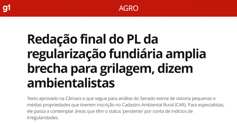 [G1] Redação final do PL da regularização fundiária amplia brecha para grilagem, dizem ambientalistas