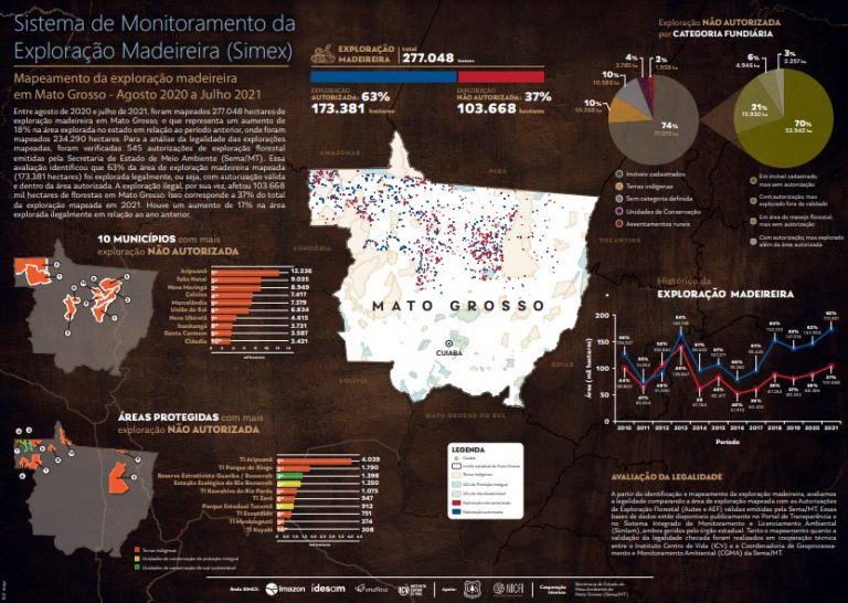 “Apesar da maior parte da exploração madeireira em Mato Grosso ter sido autorizada, a área com a atividade não permitida cresceu 17% em relação ao levantamento anterior, que analisou o período de agosto de 2019 a julho de 2020. Apenas nas terras indígenas do estado, houve um aumento de 70% na extração de madeira ilegal”, alerta Vinícius Silgueiro, coordenador de inteligência territorial do ICV.