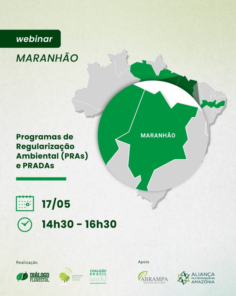 No dia 17 de maio, o Maranhão será o foco de um novo webinar sobre a implementação dos Programas de Regularização Ambiental (PRAs) nos estados brasileiros. O debate é parte de uma série de webinars realizada pelo Diálogo Florestal, em parceria com o Observatório do Código Florestal e a Coalizão Brasil Clima, Florestas e Agricultura, e tem o apoio da Associação Brasileira dos Membros do Ministério Público de Meio Ambiente (Abrampa) e da Aliança pela Restauração na Amazônia.