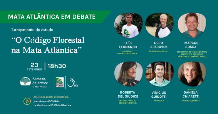 No dia 23 de setembro, às 18h30, acontece o debate de lançamento do estudo “O Código Florestal na Mata Atlântica”, parceria da Fundação SOS Mata Atlântica, GeoLab Esalq-USP, Imaflora e Observatório do Código Florestal.